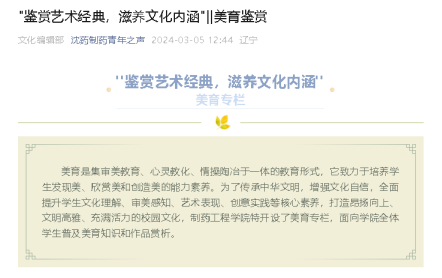美育是集审美教育、心灵教化、情操陶冶于一体的教育形式,它致力于培养学生发现美、欣赏美和创造美的能力,全面提升学生文化理解、审美感知、艺术表现、创意实践等核心素养。beat365官方网站将美育教育与文化建设相结合,在“制药青年之声”微信公众号上推出了"鉴赏艺术经典,滋养文化内涵"——美育鉴赏专栏,通过展示中国名画和名家书法,启迪学生对艺术审美的思考,打造昂扬向上、文明高雅、充满活力的校园文化,传承中华文明,增强文化自信。