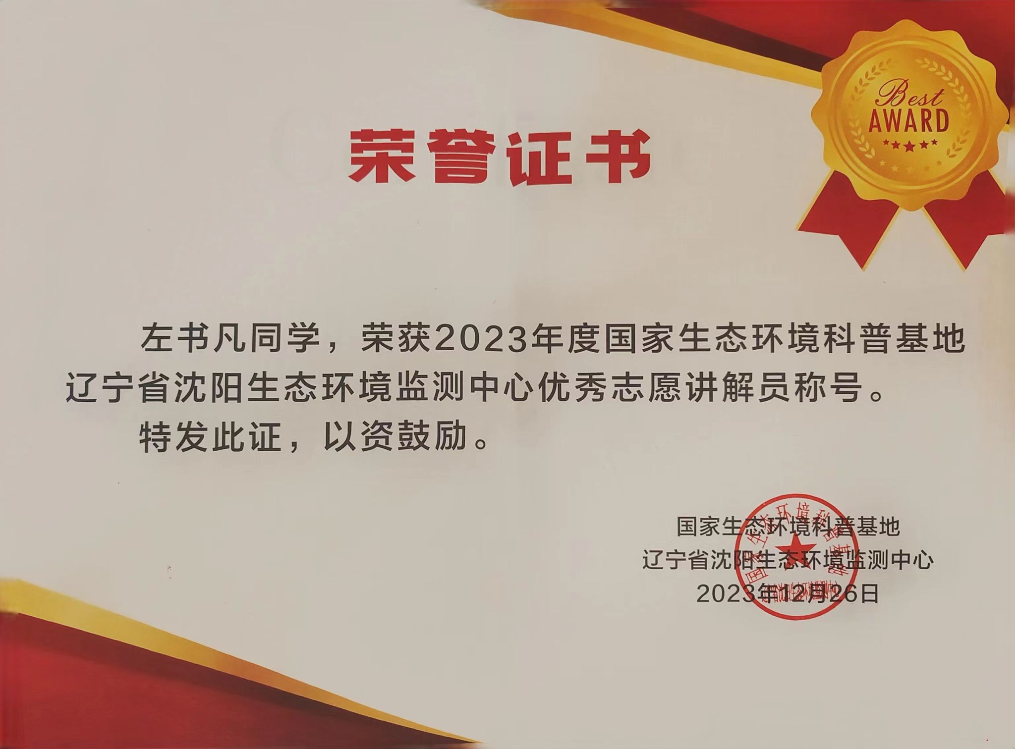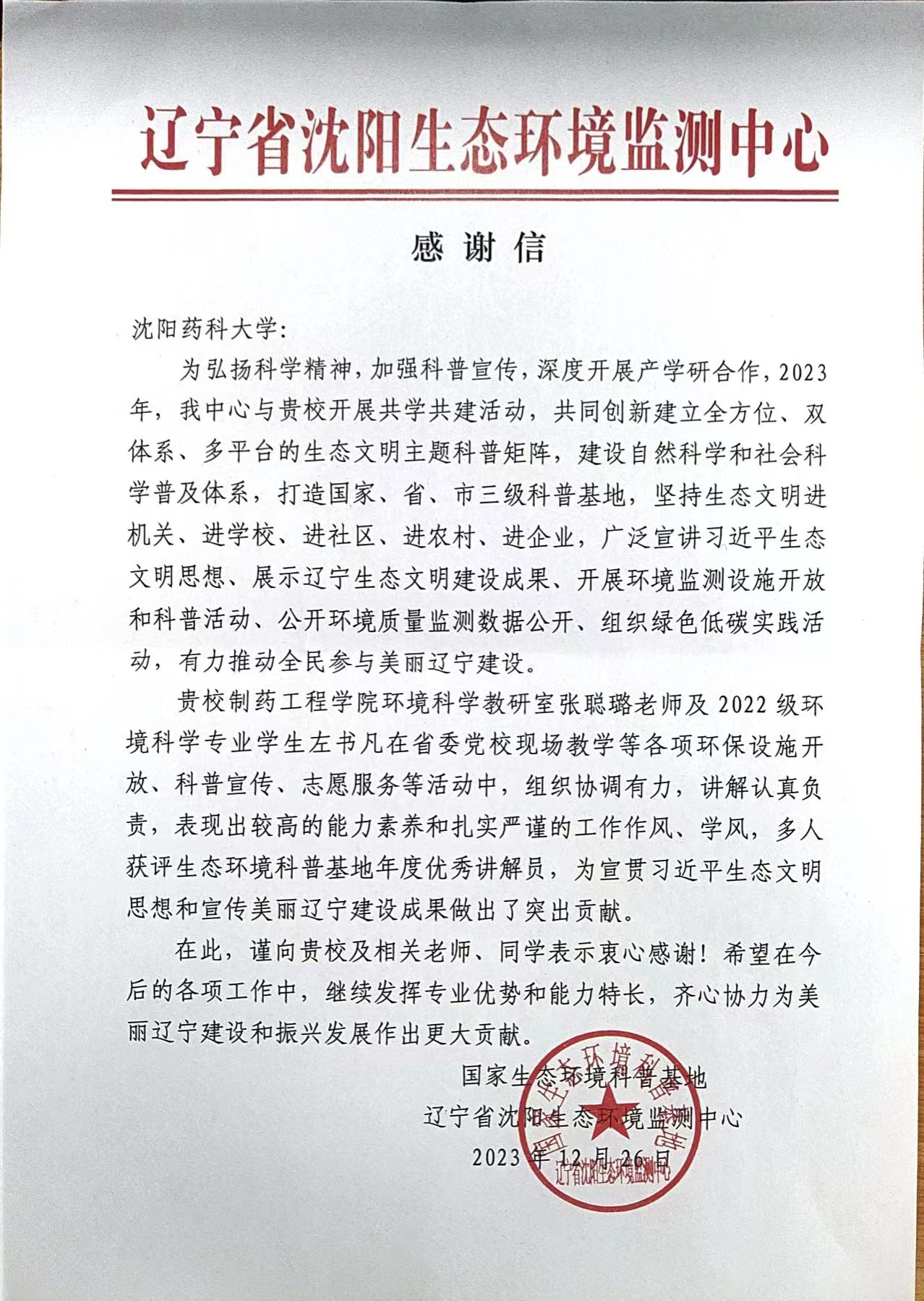 近日,beat365官方网站收到一封来自辽宁省沈阳生态环境监测中心的感谢信。信中对beat365官网环境科学教研室张聪璐老师及2021级环境科学专业学生左书凡,在省委党校现场教学等各项环保设施开放、科普宣传、志愿服务等活动中的能力素养、工作作风和学风给予高度肯定和赞扬,对我校志愿者表示了由衷的感谢和诚挚的敬意。