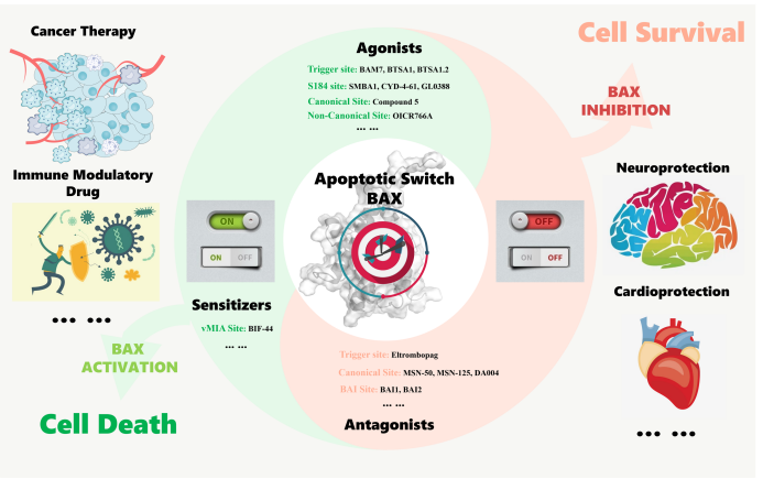 促凋亡蛋白BAX是一种分子量为21-KDa的球状蛋白,由9个α螺旋组成,其功能是作为线粒体调控的细胞死亡通路中的效应蛋白(Effectors),在机体发育、组织内稳态和免疫调节等方面发挥关键调控作用。BAX的功能失调与以细胞死亡失调为特征的多种疾病的发生和进展密切相关,如肿瘤、自身免疫性疾病、神经退行性疾病和心力衰竭等。本文综述了BAX的生理学功能和调控机制,总结了直接靶向BAX不同构象和调控位点的小分子凋亡调节剂的发现、作用机制、研究进展,及临床应用前景,为直接靶向BAX的创新药物研究提供了参考。