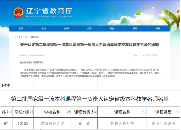近日,辽宁省教育厅认定了第二批国家级一流本科课程第一负责人为辽宁省普通高等学校本科教学名师,同时公布了2023年辽宁省普通高等学校本科教学名师评选结果,beat365官方网站翟鑫教授作为第二批国家级一流本科课程《药物合成反应》第一负责人入选辽宁省普通高等学校本科教学名师,至此,beat365官网已有省级教学名师10人。