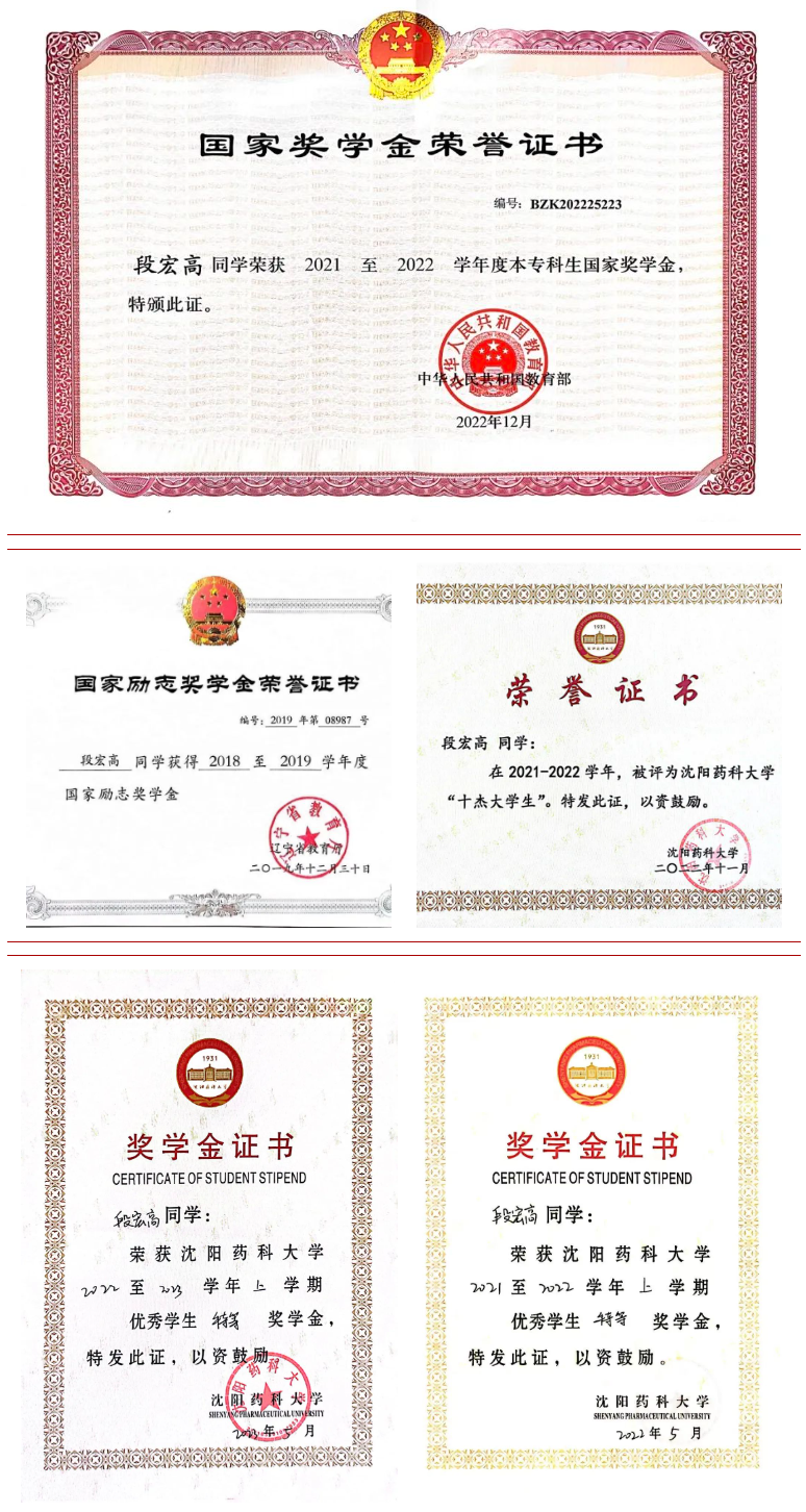 段宏高,beat365官方网站药物化学专业2020级本科生。前五学期平均成绩学院排名前1%,曾获国家奖学金2次,“十杰大学生”“十佳学习标兵”等各1次,曾服役于中国人民武装警察部队,获嘉奖和“四有”优秀士兵奖章各1次。发表SCI文章1篇,参与省级大学生创新项目1项,现已保研为北京大学药学院直博生(拟录取)。