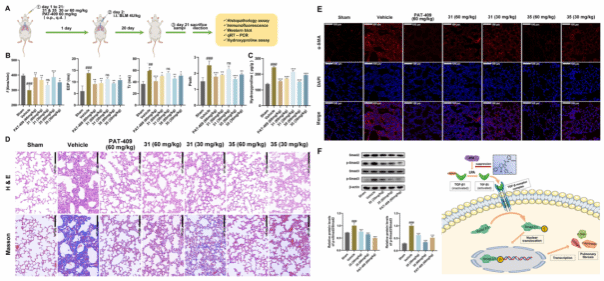 体内药效学研究表明,化合物31和35以60 mg/kg剂量给药能够显著抑制博来霉素诱导的肺纤维化发展。分子机制研究表明,化合物35能有效降低肺组织中p-Smad2和p-Smad3的上调,证实其通过调节TGF-β/Smad信号通路来发挥抗肺纤维化作用。同时,化合物35表现出良好的药代动力学性质和安全性。