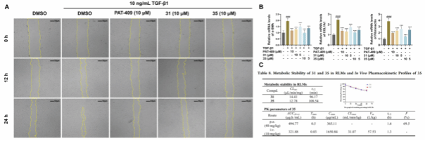化合物31和35能显著抑制TGF-β1诱导的细胞迁移,并降低纤维化相关的基因(α-SMA、COL1A1、FN)的表达和良好的代谢稳定性(t1/2 > 96 min, CLint < 14.5 µL/min/mg)。