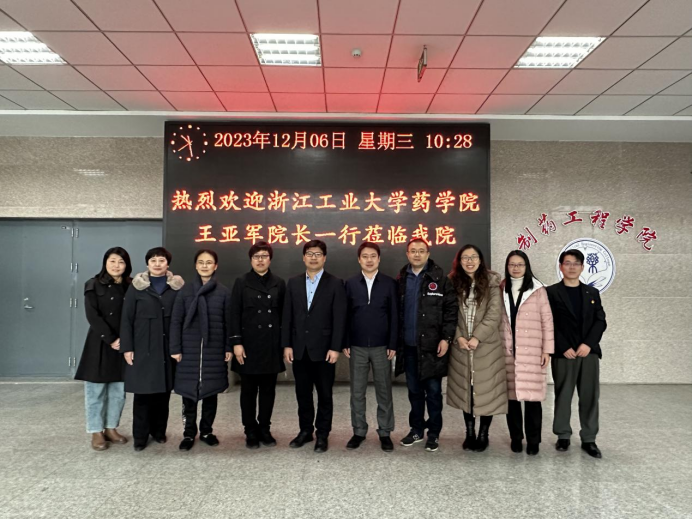 12月6日,浙江工业大学药学院院长王亚军、副院长谢媛媛、副院长李行诺、学院党委副书记乔婧芳、学科办副主任楚楚、学院办公室主任高丽萍一行6人来到beat365官网进行访问,就推动双方开展绿色制药协同创新进行调研。学院院长刘洋、院党委书记李哲、药学院副院长赵云丽、有机教研室教师任旭红、药物化学教研室教师吴成军参加了调研座谈。