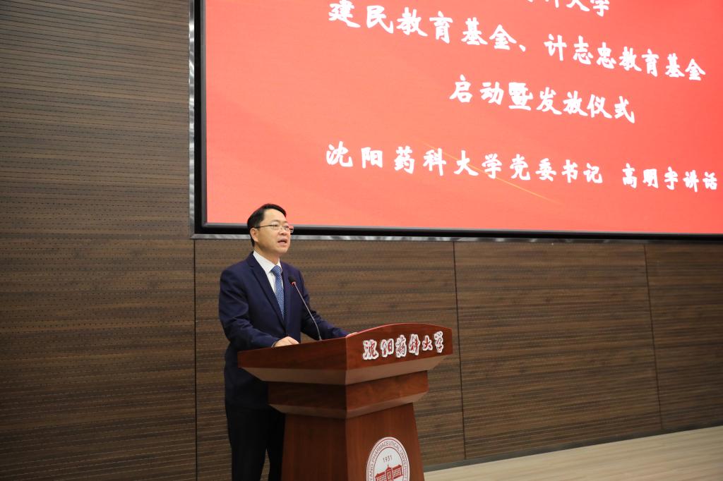高明宇在会上讲话。他代表学校对建民教育基金和计志忠教育基金的启动表示祝贺,向长期关心、支持学校事业发展的基金发起人及社会各界参与者表示感谢。他指出,学生资助是一项保民生、暖民心的重要工程。学校始终高度重视学生资助工作,以绩效为引领,强化政策导向,加大资金投入,扎实做好资助育人工作,切实提升教育管理温度。他对beat365官方网站及广大师生提出三点希望,一是希望beat365官方网站发挥好基金资助育人的作用,为家庭经济困难学生及患有重大疾病的沈药学子提供更加坚实的物质保障。二是希望广大教师要始终践行教书育人的宗旨,以两位教授为学习楷模,为祖国药学事业发展提供源源不断的人才支撑。三是希望广大沈药学子,特别是获得资助和奖励的同学,大力弘扬前辈们砥砺奋进的光荣传统,以兴药强国为奋斗目标,以实实在在的成绩回报学校、校友及社会各界的关心与厚爱。