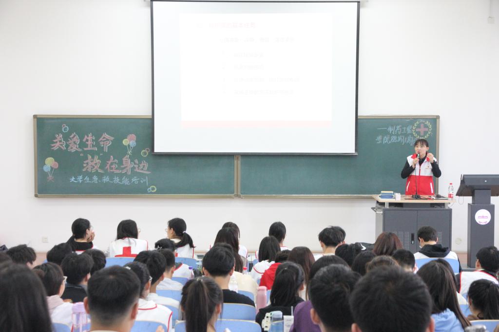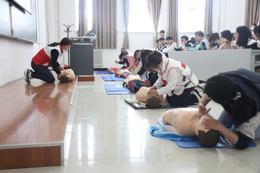 理论培训由本溪红十字会翟老师主讲,翟老师在讲台上声情并茂地为同学们介绍现场应急救护、成人心肺复苏等理论知识。在理论课程上,翟老师还亲身示范,并让学生们在讲台前进行心肺复苏的实践教学。翟老师的教学生动有趣,同学们听讲也十分认真,课堂氛围积极融洽。