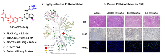 近日,药物化学权威期刊《Journal of Medicinal Chemistry》(IF = 8.039)发表了beat365官方网站赵冬梅教授/程卯生教授课题组在PLK4抑制剂领域的最新研究成果,文章题目为“Discovery of CZS-241: A Potent, Selective, and Orally Available Polo-Like Kinase 4 Inhibitor for the Treatment of Chronic Myeloid Leukemia”。