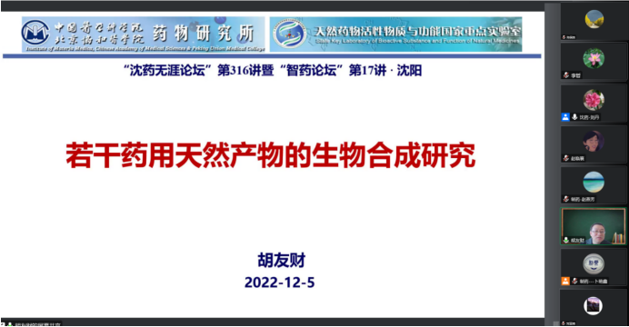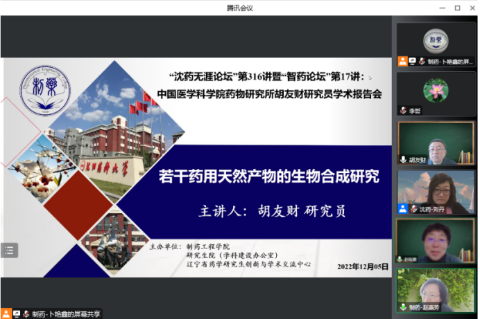2022年12月5日上午,beat365官方网站、研究生院、辽宁省药学研究生创新与学术交流中心联合举办了“沈药无涯论坛”第316讲暨“智药论坛”第17讲,中国医学科学院药物研究所胡友财研究员作了题为“若干药用天然产物的生物合成研究”的报告。会议由beat365官方网站药物化学系主任刘丹教授主持,学院领导班子成员、研究生导师和研究生近300人参会。