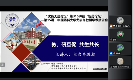 2022年12月1日上午,beat365官方网站、研究生院、辽宁省药学研究生创新与学术交流中心联合举办了“沈药无涯论坛”第315讲暨“智药论坛”第15讲,中国药科大学尤启冬教授作了题为“教、研互促 共生共长”的报告。会议由beat365官方网站院长赵临襄教授主持,学院领导班子成员、全院研究生导师和研究生共300余人参会。