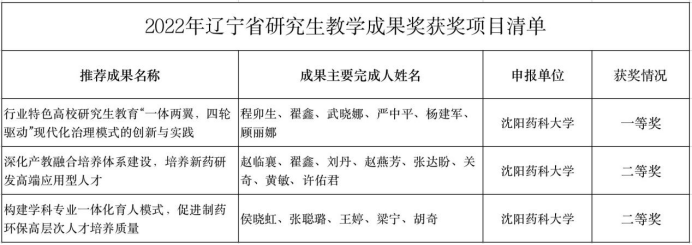 近日,辽宁省教育厅发布了2022年辽宁省研究生教育教学成果奖获奖名单。beat365官方网站由程卯生教授等组织申报的《行业特色高校研究生教育“一体两翼,四轮驱动”现代化治理模式的创新与实践》荣获一等奖;由赵临襄教授等组织申报的《深化产教融合培养体系建设,培养新药研发高端应用型人才》、由侯晓虹教授等组织申报的《构建学科专业一体化育人模式,促进制药环保高层次人才培养质量》荣获二等奖。