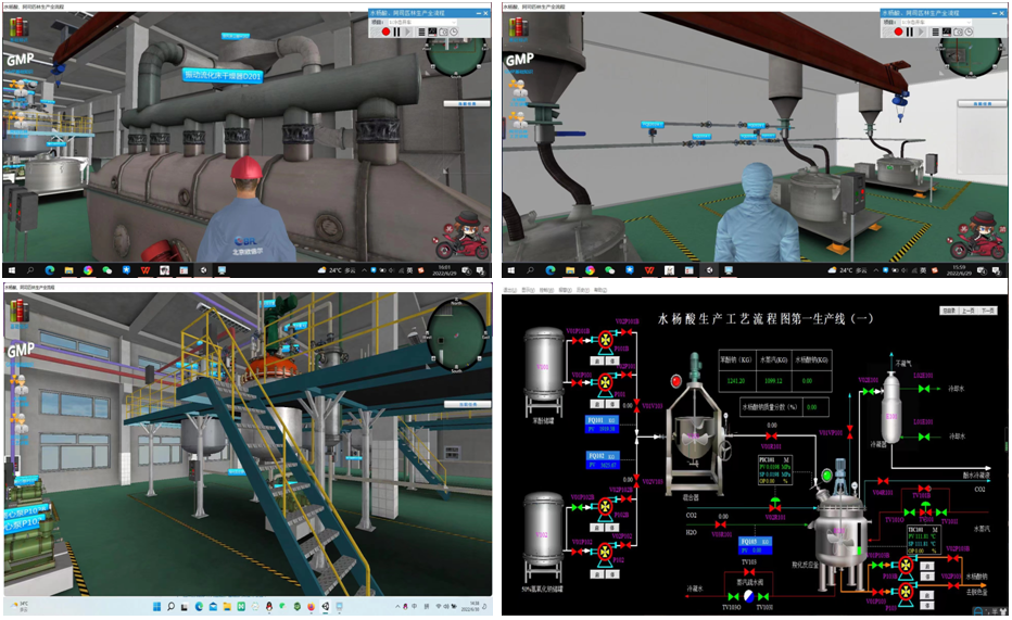 针对实训老师讲授的生产线,学生们在北京欧倍尔软件技术开发有限公司的技术平台上进行仿真练习。本次车间生产实习选用阿司匹林生产全流程软件,平台采用虚拟技术搭建出逼真的车间环境、工艺设备、生产流程。通过实操练习,学生系统理解了车间生产知识和操作流程。同时,虚拟的车间环境与生产设备解决了线上教学与实地操作的壁垒,也兼顾了不同学生学习进度的差异性,更好地保证实习教学的效果。
