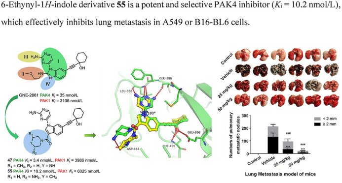 beat365官方网站程卯生教授团队在X射线结晶学和结构优化的指导下,通过对先导化合物进行多轮结构优化,得到了一系列3-取代-6-取代乙炔基-1H-吲哚类化合物。作为II类PAKs抑制剂,该系列化合物对PAK4蛋白激酶具有显著的抑制活性和特异性。其中,化合物55对肺癌细胞株A549和黑色素瘤细胞株B16在2.5μM浓度下的迁移抑制率大于40%和60%,优于阳性对照GNE-2861,表现出优异的抗迁移和抗侵袭性能;体内药动实验表明,化合物55在小鼠体内具有适中的半衰期与代谢速率;在裸鼠A549和B16-BL6移植瘤肺转移模型中,化合物55对肺表面转移结节的抑制率分别超过80%和90%。机制研究表明,化合物55减轻转化生长因子-β1诱导的上皮-间充质转化,能够有效抑制肿瘤的迁移、侵袭及转移行为。