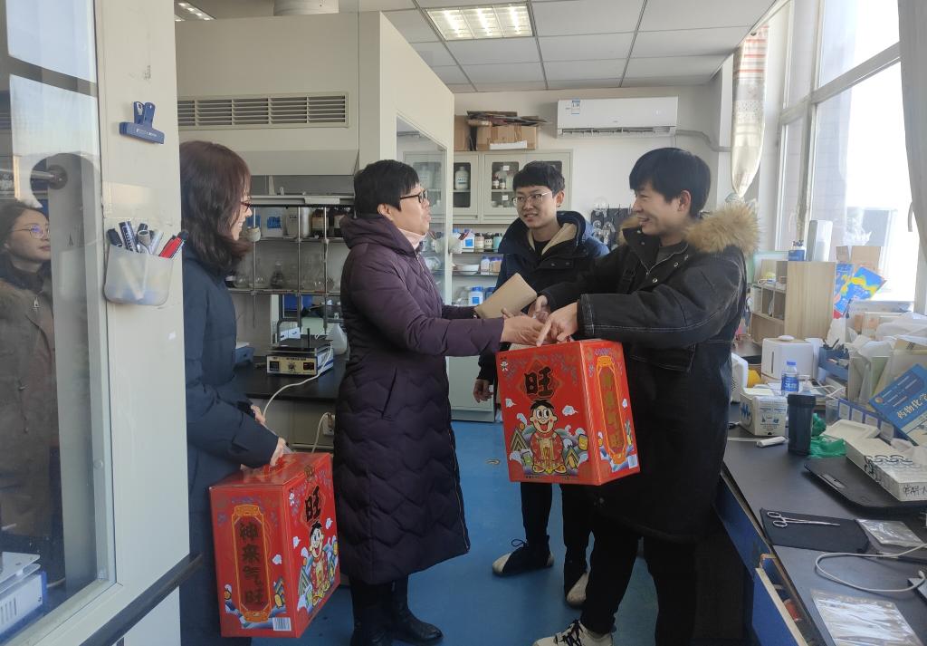 1月30日上午,李哲一行来到留校同学们的实验室及寝室走访看望、座谈畅聊,与同学们进行面对面交流。李哲亲切询问了留校学生的生活和学习情况,嘱咐同学们要劳逸结合,常与家人联系,汇报在校情况,避免家人担心;鼓励同学们利用好假期在校时间,不断充实自己。同时,她特意叮嘱同学们要严格遵守学校各项疫情防控规定,做好个人防护,注意人身和财产安全,安全实验,在学校过个平安吉祥年。老师们还为留校同学亲手送上学院精心准备的新年礼包与水果,祝愿大家度过一个温暖而有意义的春节。