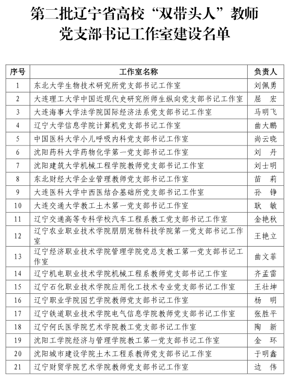 近日,辽宁省委教育工委办公室发布《关于公布第二批辽宁省高校“双带头人”教师党支部书记工作室建设名单的通知》,全省21个本、专科高校教师党支部工作室位列建设名单。其中,由药物化学教研室主任刘丹教授负责的beat365官方网站药物化学第一党支部书记工作室成功入选第二批辽宁省高校“双带头人”教师党支部书记工作室。