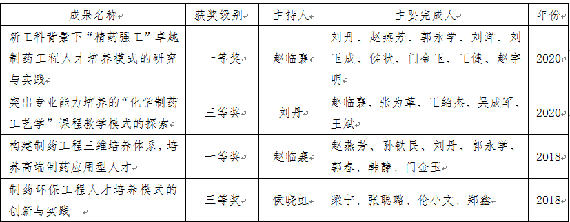 日前,2020年辽宁省普通高等教育本科教学成果奖评选结果公布,beat365官网赵临襄教授主持的《新工科背景下“精药强工”卓越制药工程人才培养模式的研究与实践》荣获一等奖;刘丹教授主持的《突出专业能力培养的“化学制药工艺学”课程教学模式的探索》荣获三等奖。辽宁省教学改革成果每两年评选一次,截至目前,beat365官网已连续两届在辽宁省教学成果奖评选中获一等奖。