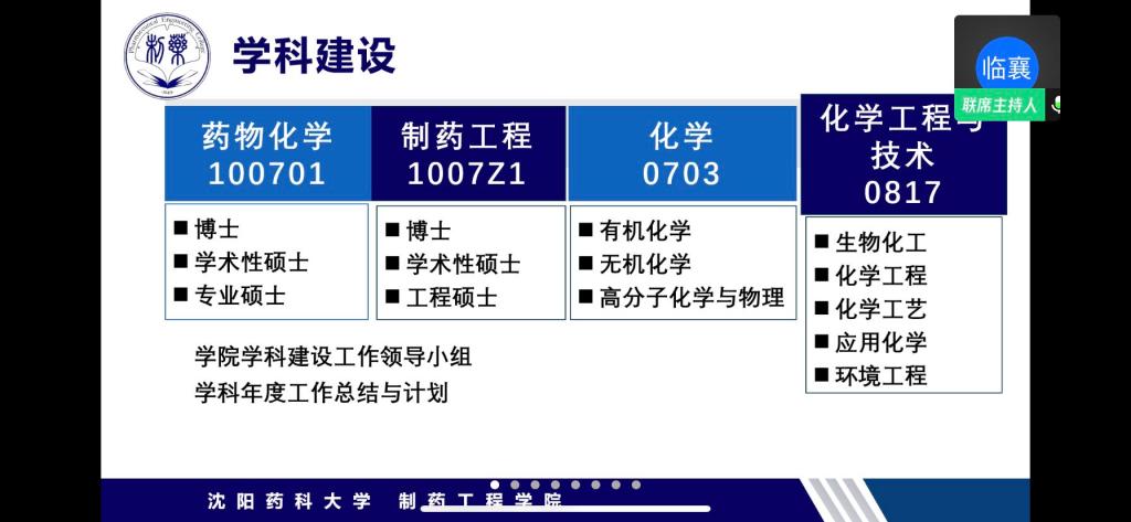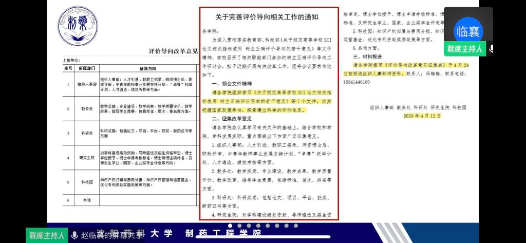 会上,学院党委书记李哲通报了目前学院疫情防控有关工作情况。学院院长赵临襄重点从关于完善评价导向相关工作、学科建设两方面进行工作部署。首先,赵院长结合学校绩效考核指标从发展战略、综合管理、制度建设等方面向参会人员阐述了“1-1-4-4”学院发展战略,并结合学校《关于完善评价导向相关工作通知》有关要求,带领参会人员共同学习了国务院、国家各部委相关工作文件。赵院长要求各教研室、实验中心会后要积极组织本部门教师进行学习,并结合我校实际情况提出反馈意见。接下来,赵院长从学科建设管理、学科建设成果、学术影响力等方面,结合药物化学、制药工程、化学、化学工程与技术4个学科的发展实际进行学科建设整体工作部署。随后,学院副院长郭永学从“定一个目标、建一个团队、拟一份规划、填一张表格、写一份报告、做一次培训”等方面依次汇报了一流专业建设相关工作。