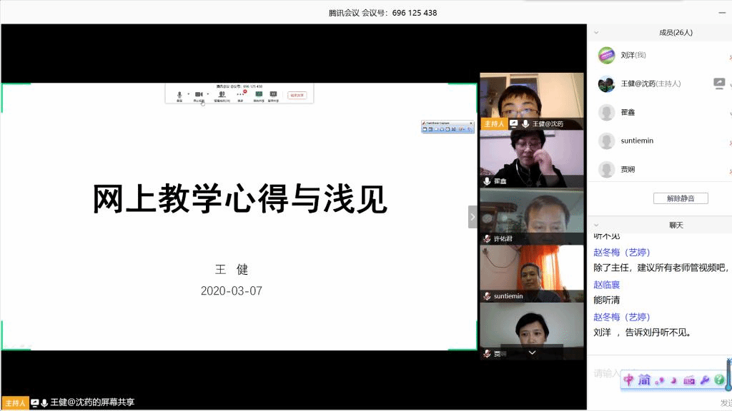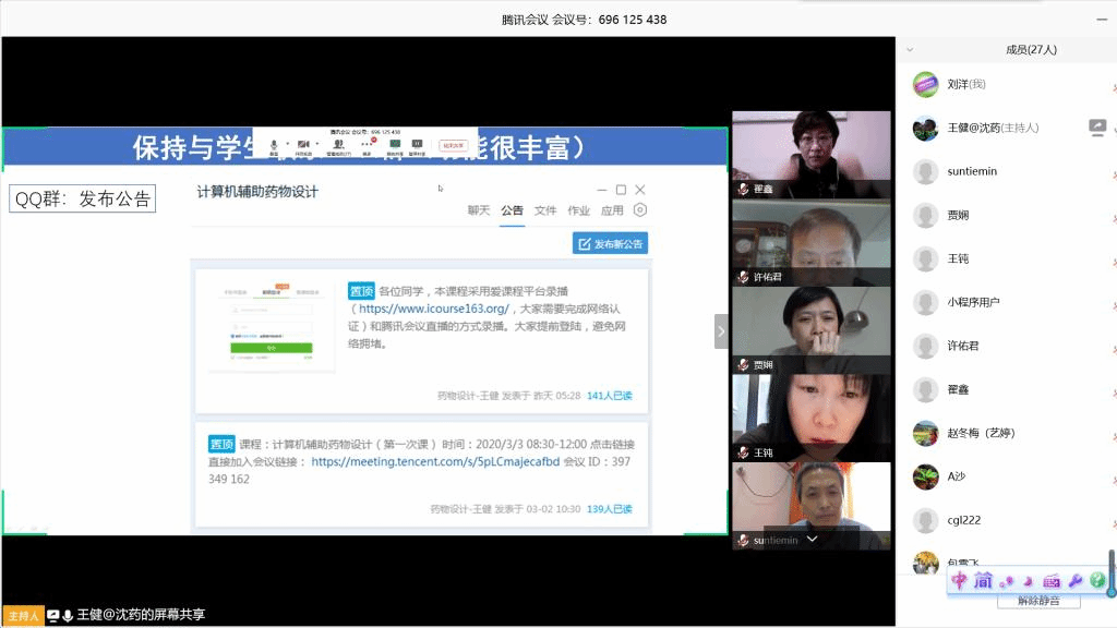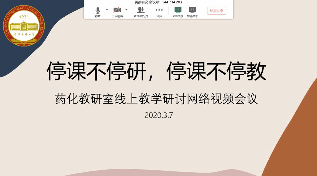 在新冠肺炎疫情防控工作的关键时期,beat365官方网站药物化学教研室积极响应教育部和校党委关于“停课不停教,停课不停学”的号召,于3月7日上午应用腾讯会议平台,召开网络视频工作会议,切实落实学校关于“扎实做好线上教学工作”的总体要求,研讨本科生理论课程网络教学的相关要点。会议由教研室主任刘丹教授主持,教研室26位一线教师全部出席会议。