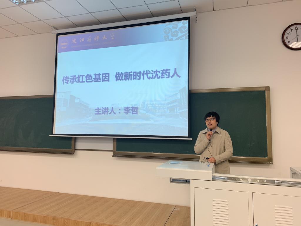 首先,李哲对制药87期新同学加入制药大家庭表示热烈欢迎。作为沈药校友,结合母校悠久的校史和光荣的革命传统,李哲书记以“传承红色基因,做新时代沈药人”为主题,从历史沿革、文化传承、学科地位、杰出校友等角度为新生详细介绍了学校;从药学家屠呦呦获诺奖带来的启示鼓励同学们在未来的学习工作中、在科学研究的道路上要“守得住清贫、耐得住寂寞,要有对学术信仰的自信和坚守,要有对科学事业的热爱与执着”。李哲书记希望同学们要学好沈药历史,传承红色基因,要有责任、有担当,努力学习,坚持不懈,不断提升自己,完善自己,努力成为担当复兴大任的时代新人。