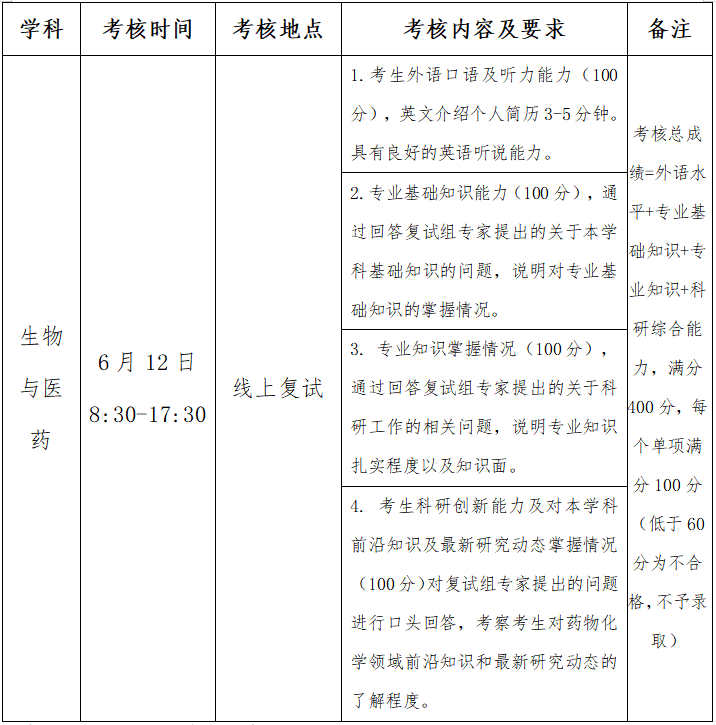 考核内容包括外语水平、专业基础知识、专业知识和科研综合能力四个模块,每个单项满分为100分,单项成绩低于60分为考核不合格不予录取。