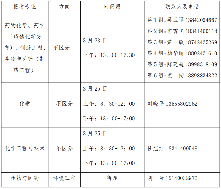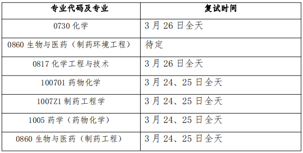 1. 考生报考专业代码和专业名称为:100701药物化学、105500药学【药物化学研究方向】、1007Z1制药工程、086000生物与医药【制药工程】。(学术与专硕须分开写,具体复试内容见附件1)