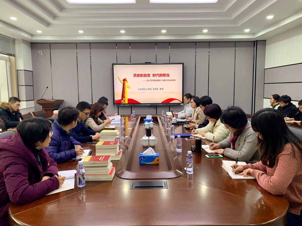 11月30日,beat365官方网站党委在制药楼227会议室召开理论学习中心组学习会,专题研讨深入学习贯彻党的十九届六中全会精神,特邀马克思主义学院形势与政策教研室徐雪松教授作《历史的自觉 时代的担当——深入学习贯彻党的十九届六中全会精神》专题讲座,学院领导班子成员、系主任、院工会主席、党支部书记、全体学生工作干部参会,会议由院党委书记李哲主持。