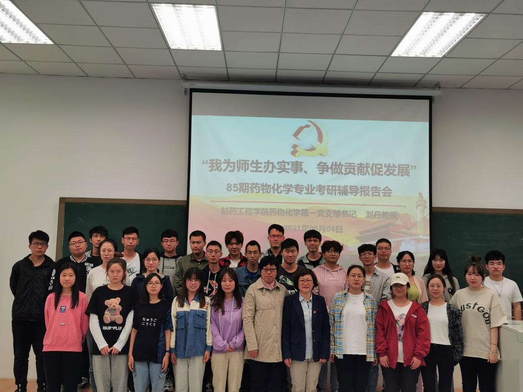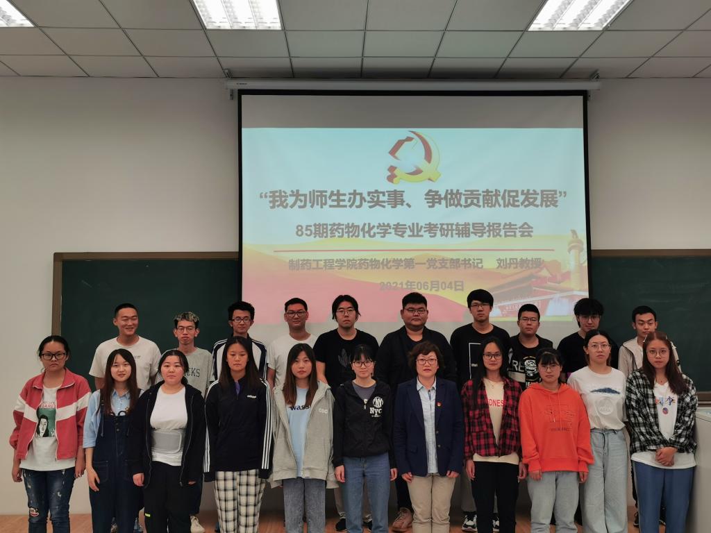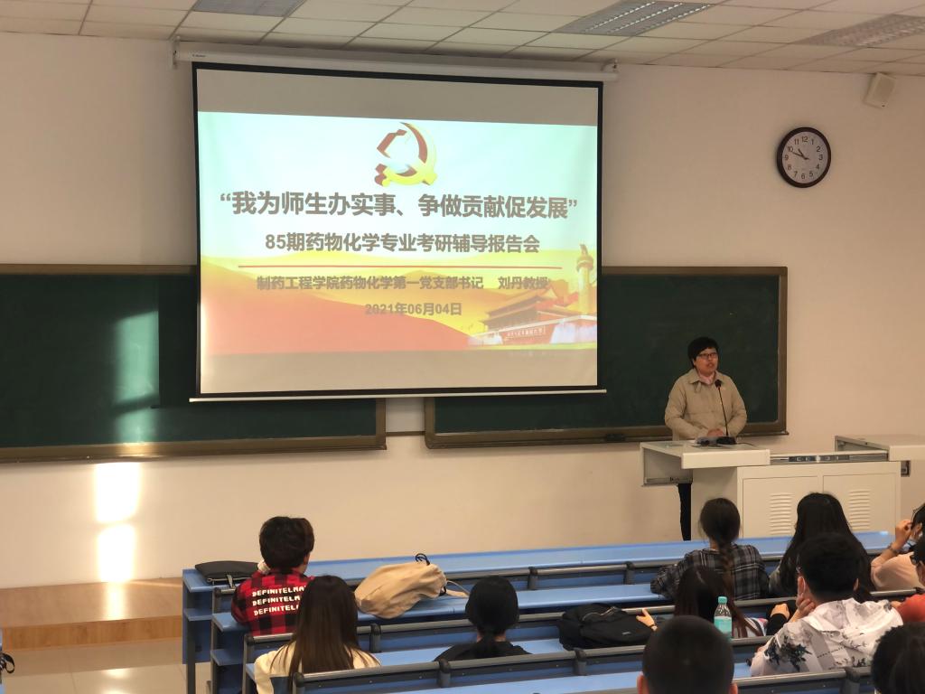 为更好地促进党史学习教育走深走实,充分发挥beat365官方网站药物化学第一党支部辽宁省高校“双带头人”教师党支部书记工作室的示范作用,将“我为师生办实事 争做贡献促发展”落到实处,6月4日晚,在第四教学楼204教室,药化第一党支部书记刘丹教授为85期药物化学专业学生做考研辅导报告,药化一班、药化二班共55名有意向参加考研的同学参与了此次考研指导会。院党委书记李哲出席并主持报告会。